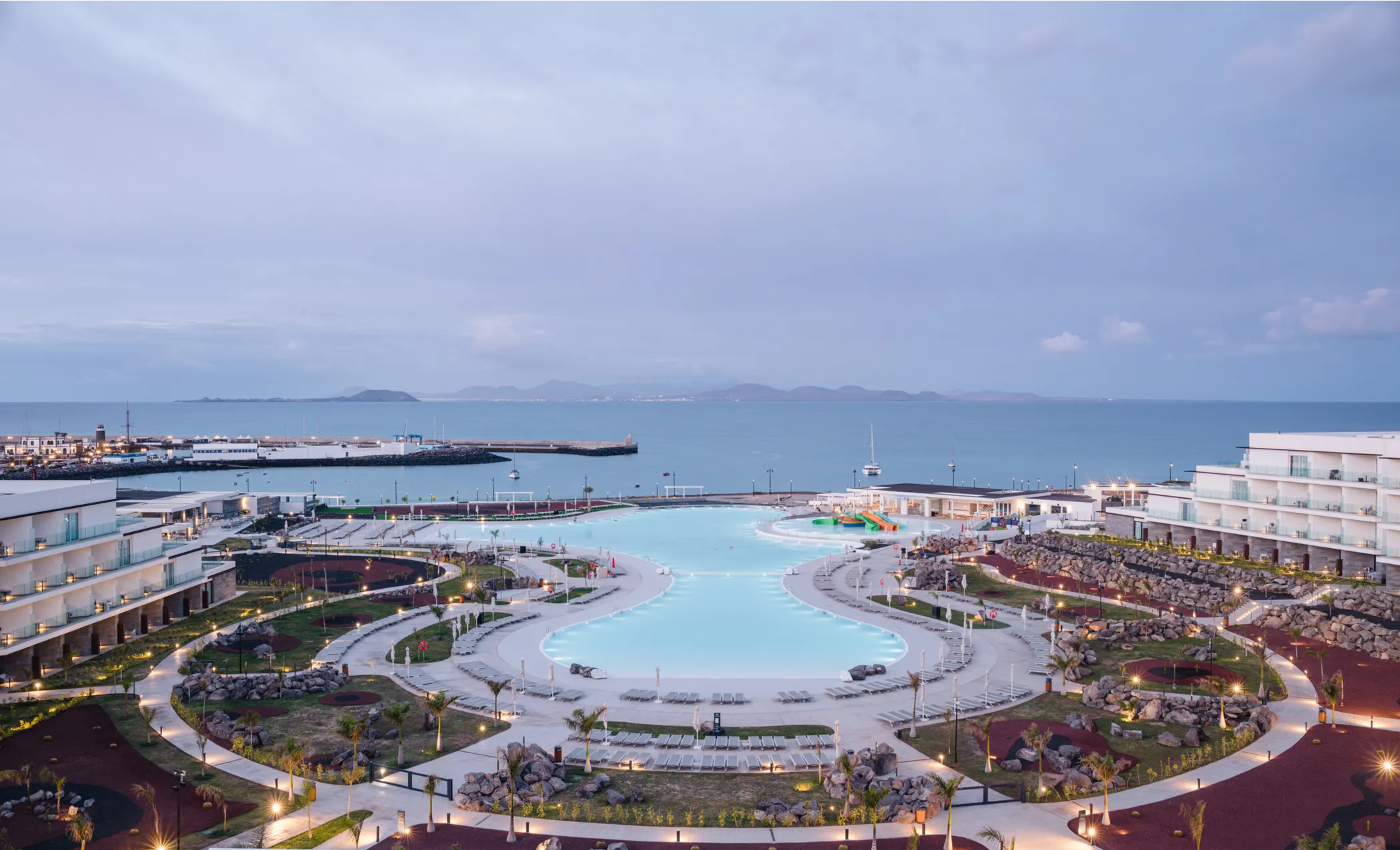 La actuación incluye diversas áreas de restauración —buffets, restaurantes temáticos, lobby bar, sport bar y bares de piscina—, un centro de convenciones y teatro con acceso independiente, y una zona wellness con spa, gimnasio y salas de actividad. En el exterior destacan las piscinas interconectadas, los jardines inspirados en la estética volcánica de César Manrique y una zona comercial de 3.496 m² frente al paseo marítimo. El conjunto se completa con pistas deportivas, aparcamientos diferenciados y áreas destinadas a autobuses turísticos.