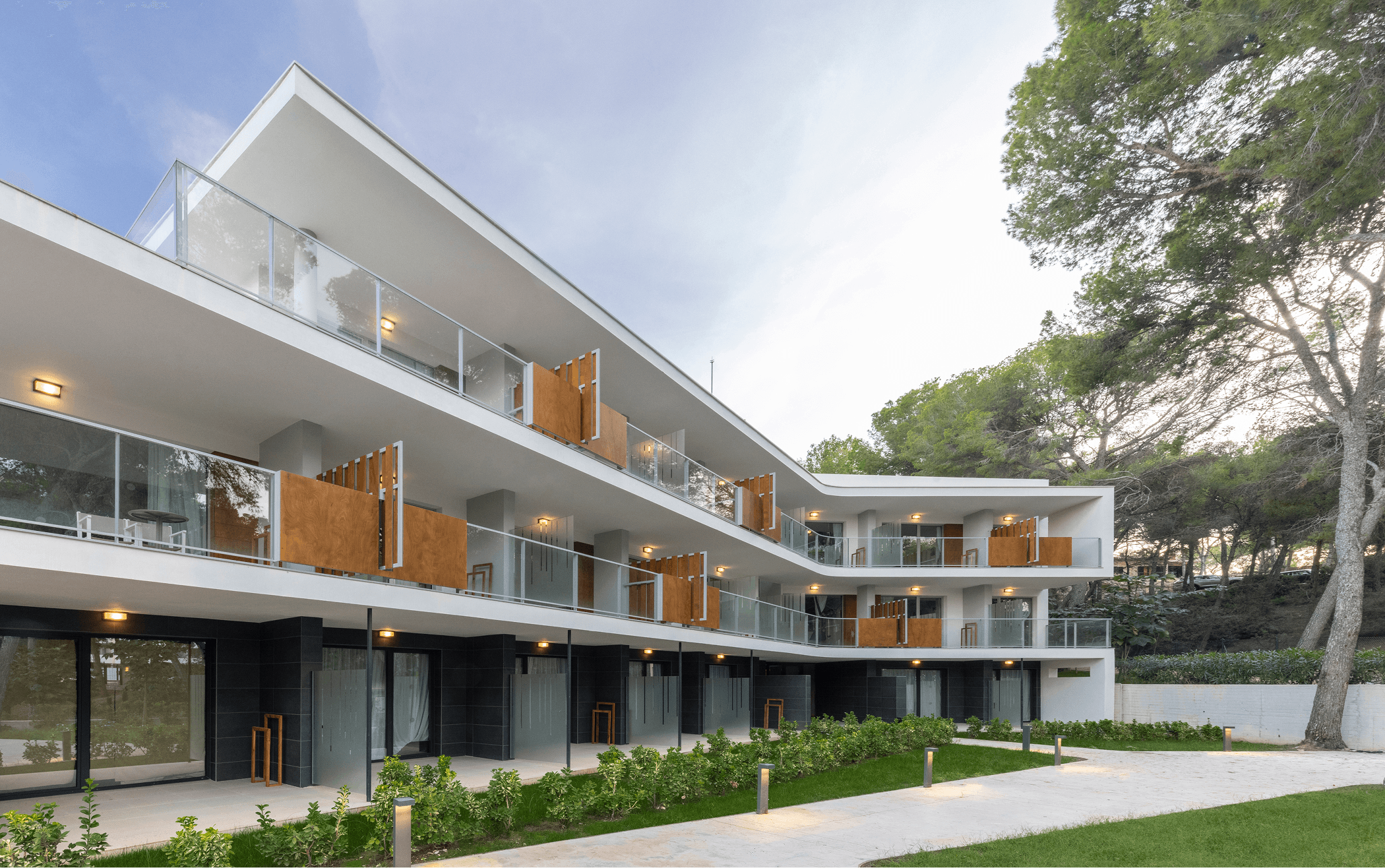 Fase 2: Reforma de más de 300 habitaciones existentes y ejecución de dos nuevos volúmenes. El primero, una ampliación sobre la recepción del hotel Pax con 18 habitaciones ejecutado en estructura de acero; el segundo, un edificio de 22 habitaciones ejecutado en hormigón armado, integrado orgánicamente en el pinar mediante una implantación escalonada.